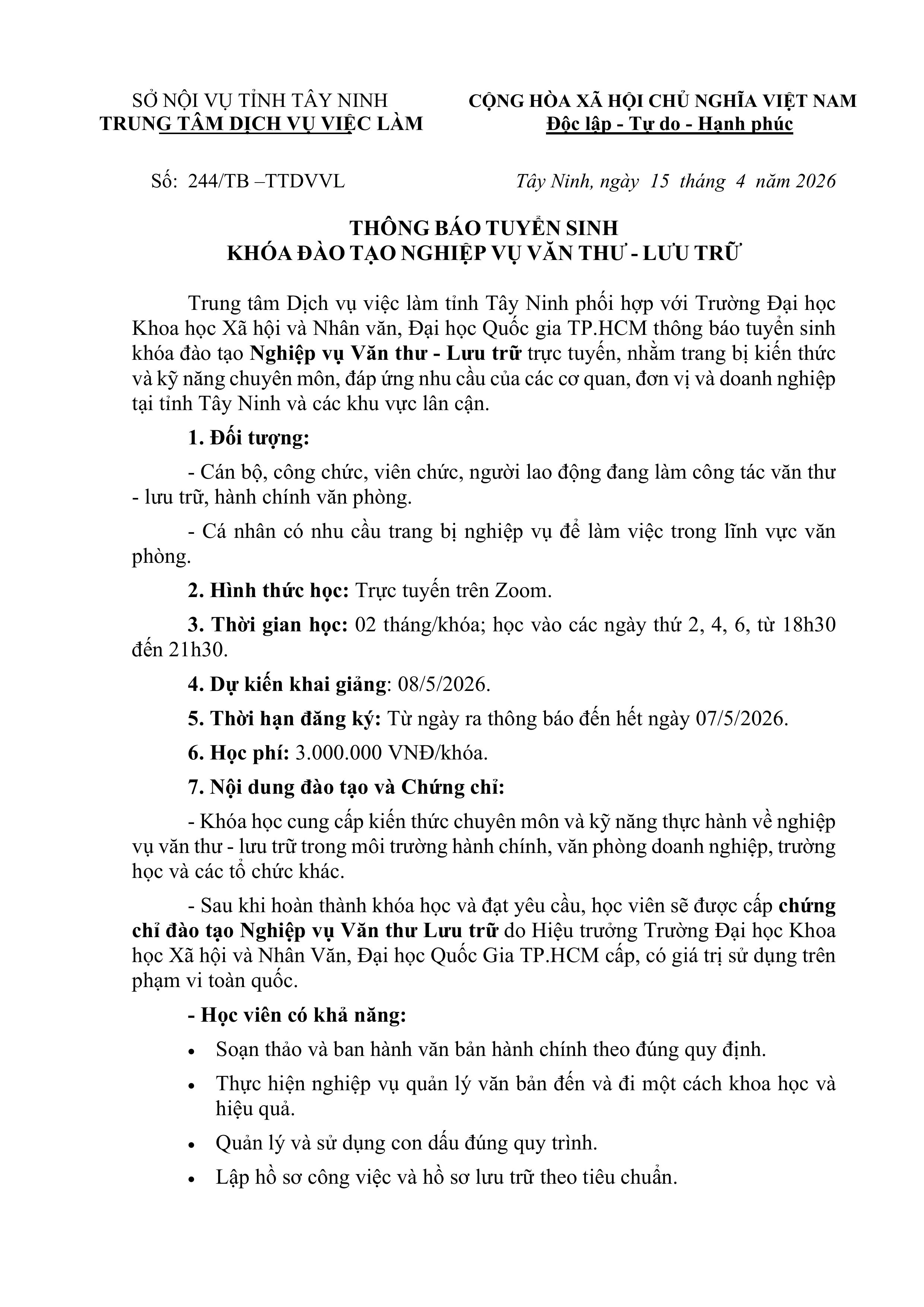 Thông báo tuyển sinh khoa đào tạo nghiệp vụ "Văn Thư - Lưu trữ" (Dự kiến khai giảng ngày 08/05/2026)