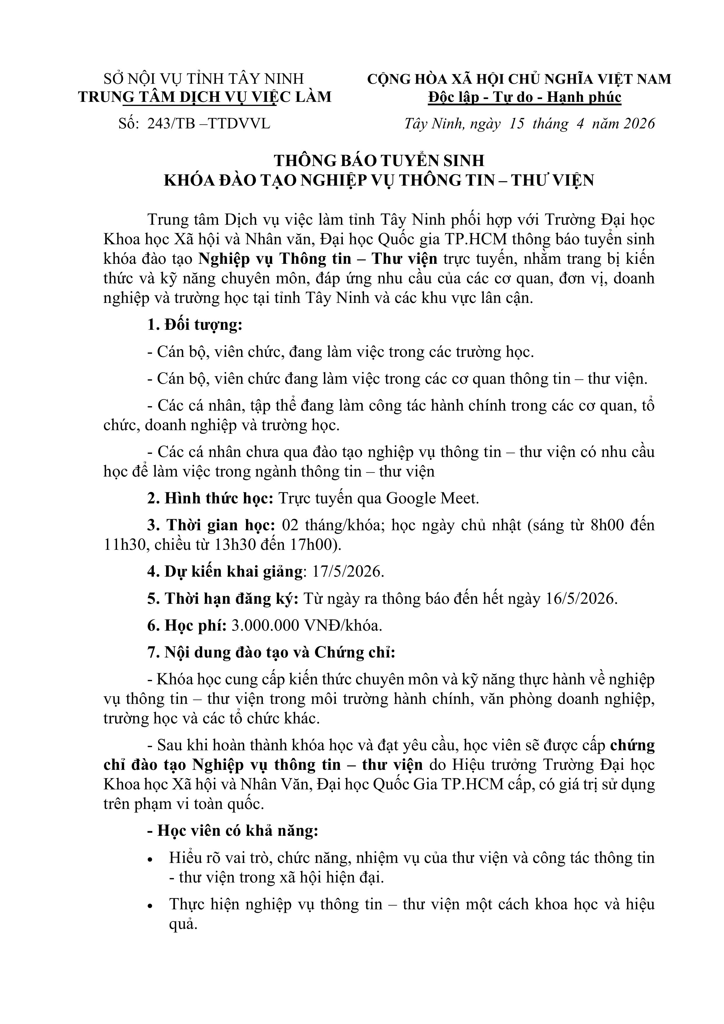 Thông báo tuyển sinh khoa đào tạo nghiệp vụ "Thông tin - Thư viên" (Dự kiến khai giảng ngày 17/05/2026)