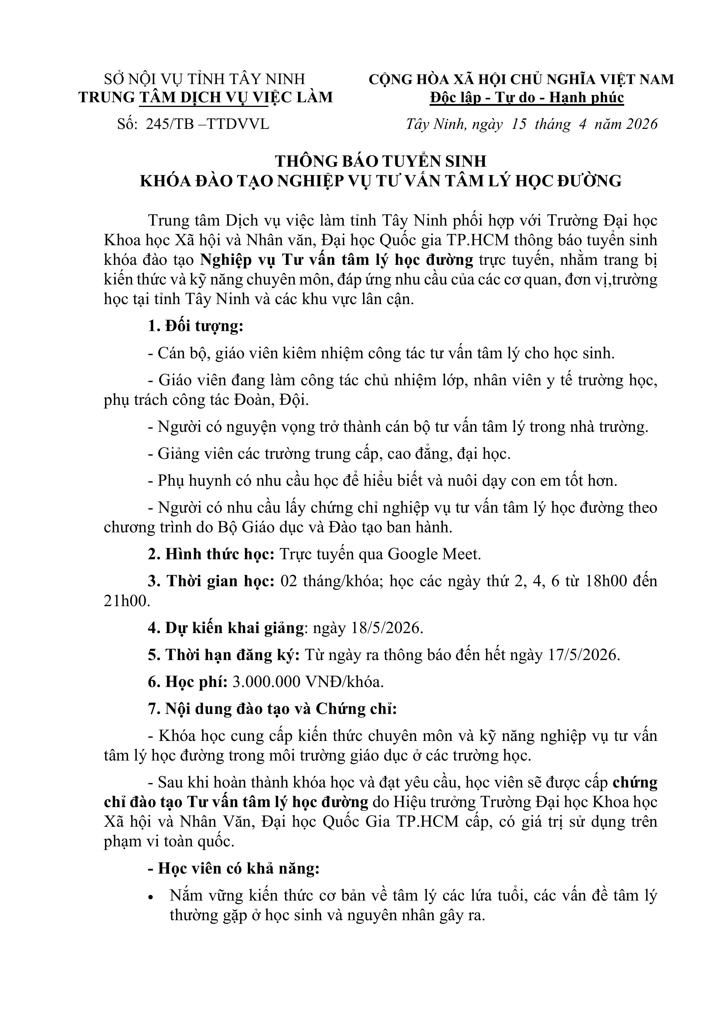 Thông báo tuyển sinh khoa đào tạo nghiệp vụ "Tư vấn tâm lý học đường" (Dự kiến khai giảng ngày 18/05/2026)